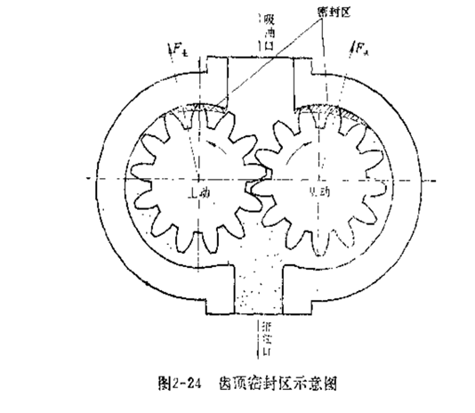 即在組裝(zhuāng)試運轉時,齒(chǐ)頂刮其殼體內(nèi)孔吸油口(kǒu)兩側,周向刮削長度(dù)為2~3個齒,刮削深度(dù)視泵體材料而定。一般鋁泵(bèng)體為0.04~0.08mm,鑄鐵泵(bèng)體應盡量小,一般不(bú)應_過0.02mm。因而形成一段密封區,如圖2-24所示。而(ér)其餘部分齒頂的間隙增大而將高壓油引入,在很大的徑向間(jiān)隙區域內,壓力都是排油口壓力,部分徑向力得到了平衡,從而減小了作用在軸承上(shàng)的徑向力。