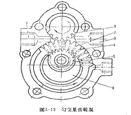 在齒輪2和5間(jiān)的鐮刀形空隙中,設有隔(gé)離零件(jiàn)6,齒輪2齒(chǐ)根部相鄰齒槽開徑向通(tōng)孔4,使2與5成(chéng)對連接。齒輪1和(hé)2的開始齧合區(qū)與排油口3連通,在齧合脫(tuō)開區與吸油口7相通。