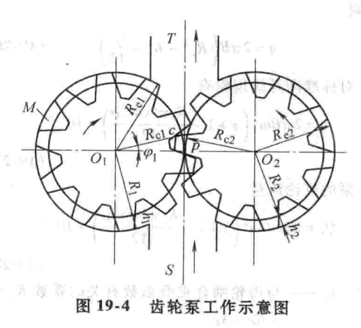 互相齧合的一對齒輪(lún)(圖 19-4 )齒輪圓柱麵積和兩端側麵與泵殼內壁之間的間隙很小,在位於過(guò)渡區內的各齒槽與泵殼內壁之間,圍成(chéng)了一係列互不相同的密封空腔(qiāng) M 。由(yóu)齧合輪齒隔開吸(xī)入腔 S 和(hé)排出腔 T