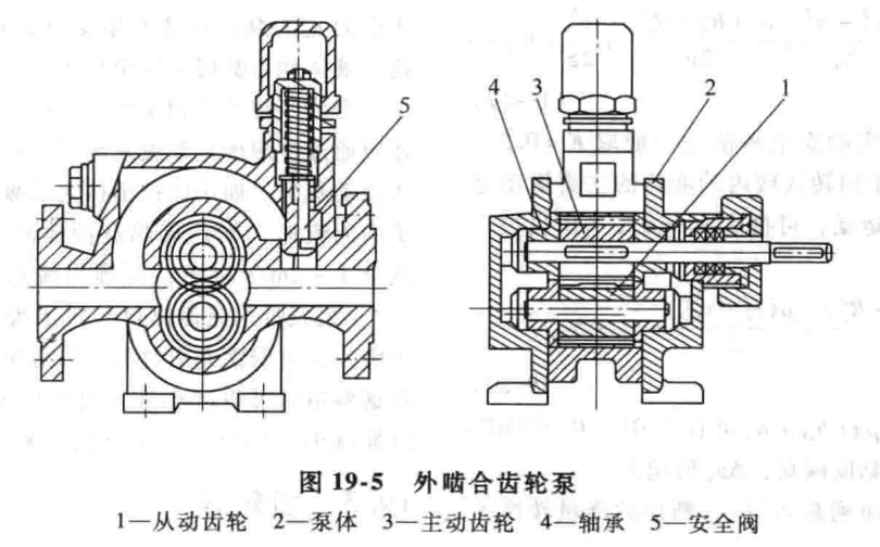 19-5 所示給出的是一台外齧合齒輪油泵的結構圖。它(tā)的從動齒輪 1 靠與之齧合主動齒輪 3 驅動,兩個轉子用內置軸承 4 支撐。因齒輪與泵體之間(jiān)的徑向間隙以及齒(chǐ)輪與(yǔ)軸承間的軸向間隙都很小,軸承支承麵和齒輪(lún)齧合麵皆需潤滑,故該齒輪油泵(bèng)隻適用與輸送潔淨、有潤滑性的介質。