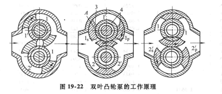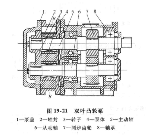 圖19-21給(gěi)出了一台(tái)雙葉凸輪泵的基本結構(gòu)。它的兩個轉(zhuǎn)子之間並不(bú)接(jiē)觸齧合,故從動轉子要靠同步齒輪7驅動旋轉,它的兩個轉子的輪葉位置(zhì)錯開90°如圖(tú)19-22所示。