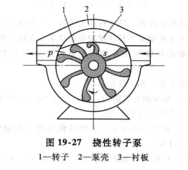 圖19-27所示為撓性轉子泵,泵的轉子1由橡膠(jiāo)等彈(dàn)性材料製成(chéng)。當轉子按圖19-27所示方向轉動時,由於襯板3的導向作用,轉子凸齒要產(chǎn)生彎曲變形(xíng),從而使S腔在與泵吸入口相通時,其容積不(bú)斷增大,進行吸液。當充滿液體的齒腔轉到與泵出口相通的(de)p腔處時(shí),其容積又隨(suí)轉子的轉(zhuǎn)動不斷減小,進(jìn)行排液。